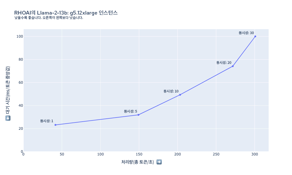 그림 5 그래프에서는 g5.12xlarge 인스턴스에서 llama-2-13B를 부하 테스트할 때 측정된 대기 시간과 처리량을 보여줍니다. 이 경우 토큰당 최소 대기 시간은 g5.2xlarge의 7B 모델보다 짧게 시작하고, 모델이 더 크고 인스턴스에 동일한 유형의 GPU가 있음에도 불구하고 처리량이 동시 요청 30개 이상으로 확장됩니다. 이는 텐서 병렬 처리를 사용하여 GPU 4개에 모델을 배포함으로써 얻는 상당한 성능 이점 때문입니다.