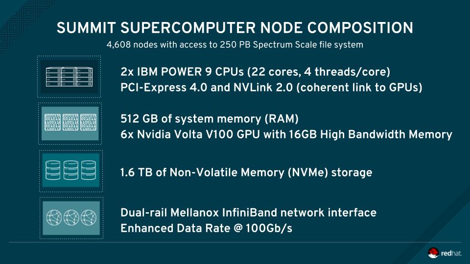 Summit, the world’s fastest supercomputer running at Oak Ridge National Laboratory (ORNL), was designed from the ground up to be flexible and to support a wide range of scientific and engineering workloads. In addition to traditional simulation workloads, Summit is well suited to analysis and AI/ML workloads - it is described as “the world’s first AI supercomputer”. The use of standard components and software makes it easy to port existing applications to Summit as well as develop new applications. As pointed out by Buddy Bland, Project Director for the ORNL Leadership Computing Facility, Summit lets users bring their codes to the machine quickly, thanks to the standard software environment provided by Red Hat Enterprise Linux (RHEL).
