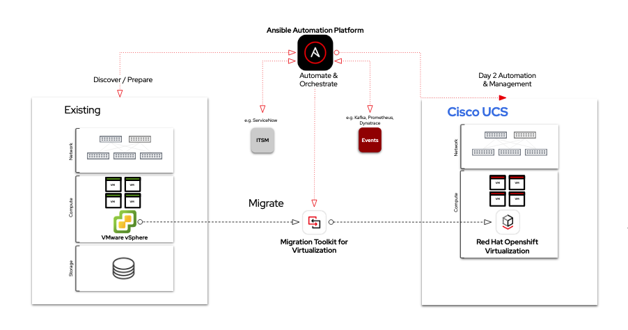- Red Hat Ansible Automation Platform은 VirtOps의 전체 라이프사이클에서 마이그레이션을 포함한 관리를 유연하게 자동화하고, 라이프사이클 전반에서 원하는 방식으로 지속적인 관리 작업과 워크플로우를 자동화합니다. 또한 Cisco Intersight, Red Hat OpenShift, 스토리지 및 네트워크 리소스, 관측성과 같은 관련 인프라에 대한 오케스트레이터 역할도 수행합니다.