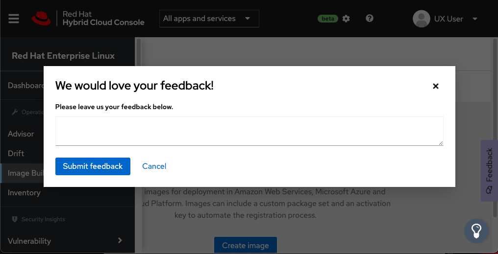 As you encounter issues with the beta service of Image Builder, or have ideas for feature enhancements, you can share them directly with the Image Builder product team using the Feedback tab pinned to the right side of the dashboard. Your direct feedback is valuable as we work towards General Availability and plan for future updates.