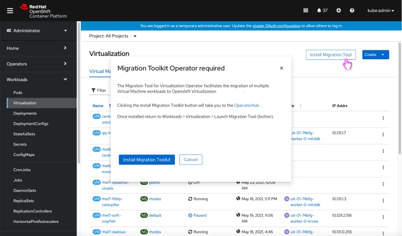The Install Migration Tool action will now be located as an independent button next to the Create dropdown menu. Once MTV is installed, this button will launch the MTV UI and open it in a new window.