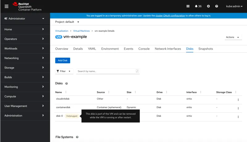 When you add a hotplugged disk to a VM, a specified badge surfaces next to their name so that you can easily distinguish them from other standard disks on your list. By default, hotplugged disks will stay attached to the VM after a restart.