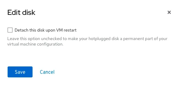 Clicking the disk’s kebab menu will open the Edit disk modal, where you can select whether you would like your hotplugged disk to detach from your VM when it restarts.