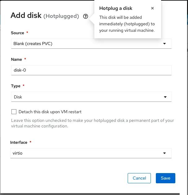 To add a hotplugged disk, open and fill out the Add disk modal.