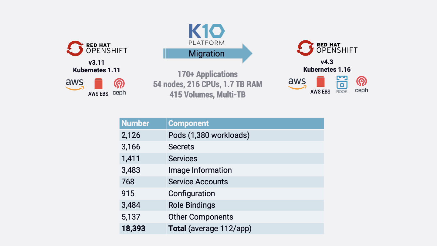 Enterprises across the globe can now use Red Hat’s OpenShift Kubernetes platform along with Kasten’s K10 software based, data platform to seamlessly rollout, upgrade, and protect their cloud-native applications. The Kasten K10 operator has been certified to work on OpenShift and enterprise operations teams now have a compelling solution to not only enable upgrades from OpenShift 3 to OpenShift 4 but also to provide backup, and disaster recovery for applications at scale. This post elaborates on the advantage of this solution and brings to life the benefits realized by one of the largest European players in the IT industry.