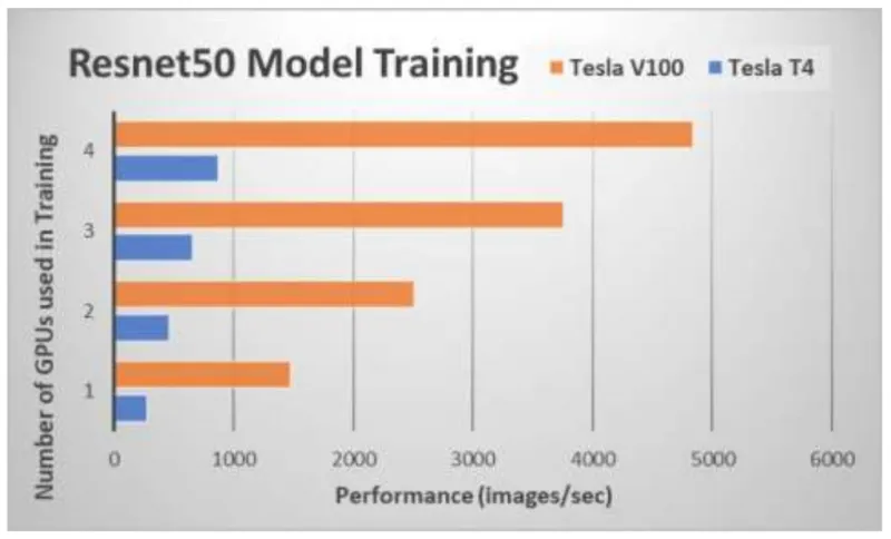 The researchers compared the GPU models when training the Resnet50 TensorFlow benchmark. This is shown in the figure above. Not surprisingly, the Tesla V100s outperformed the T4s when training. They have double the compute capability -- both in terms of FP64 and TensorCores -- along with higher memory bandwidth due to the HBM2 memory subsystem. But the T4s should give better performance per Watt than the V100s when running less floating-point intensive tasks, particularly inferencing in mixed precision.