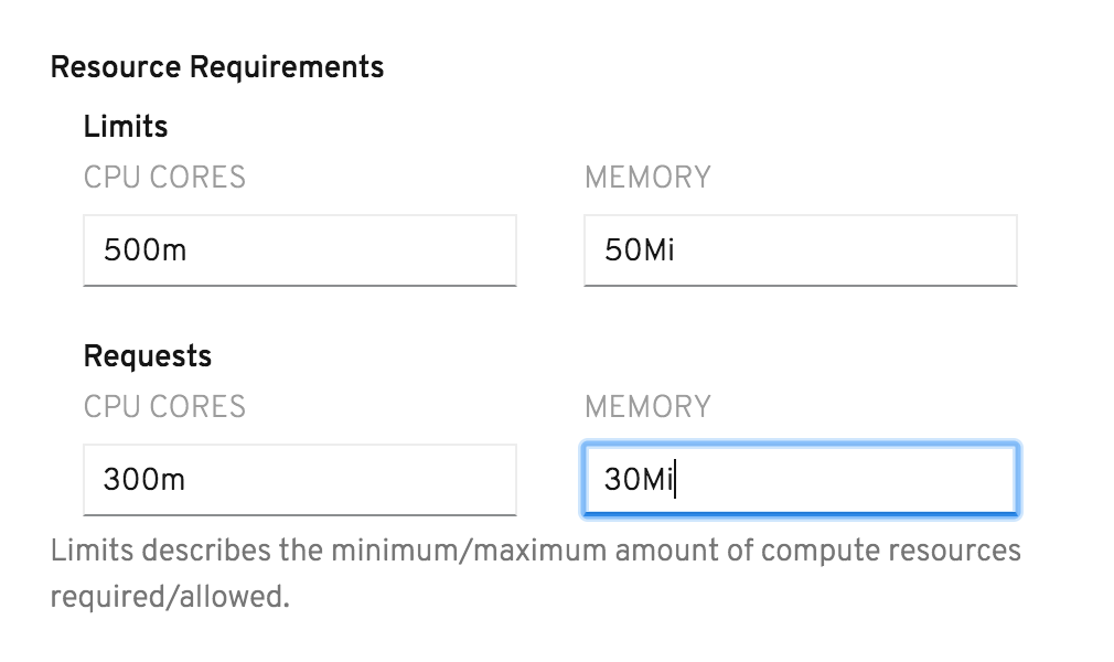 The Resource Requirement react component will then show up on the UIs for creating or mutating your custom resource in OpenShift console. For example, in Create Couchbase Cluster view, UI shows both Limits and Requests fields: