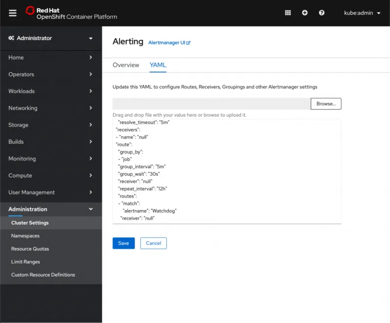 OpenShift 4.3 contains a new Alertmanager section on the cluster settings page. The options it provides make it easier than ever to tell OpenShift’s monitoring tools how and where to send you notifications.