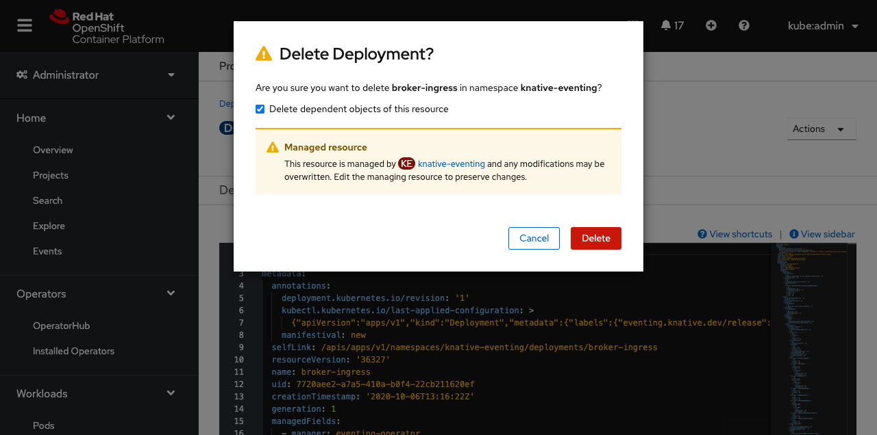 Resources that are managed by a particular operand from an operator are now marked with a Managed by label under their name, to show the relationship. The label also includes a link to the operand for quick navigation to edit that managing resource where you can be sure your changes will stick.