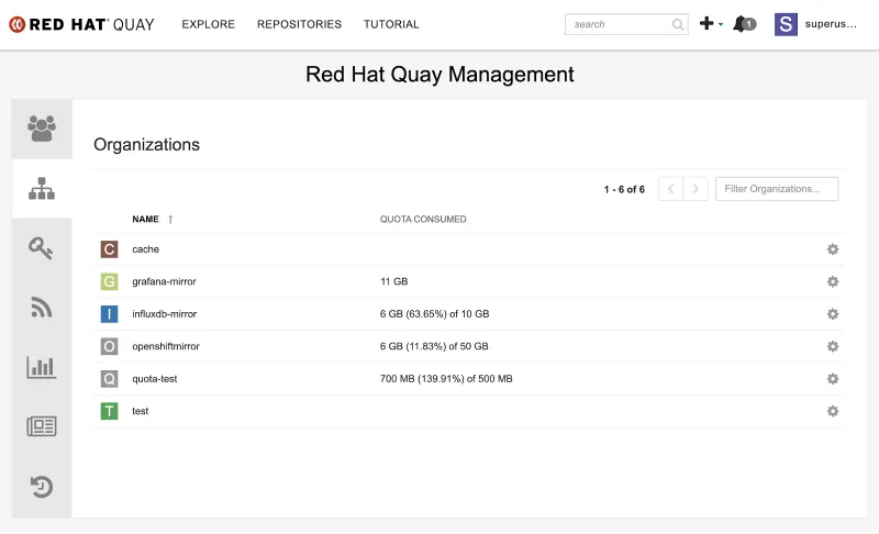 To that end, a Quay administrator can now also see the storage utilization of all tenant organizations in the registry from the super user panel, to easily spot the biggest storage consumers in the system and also identify organizations which have exceeded their quota but don’t have a reject policy in place.