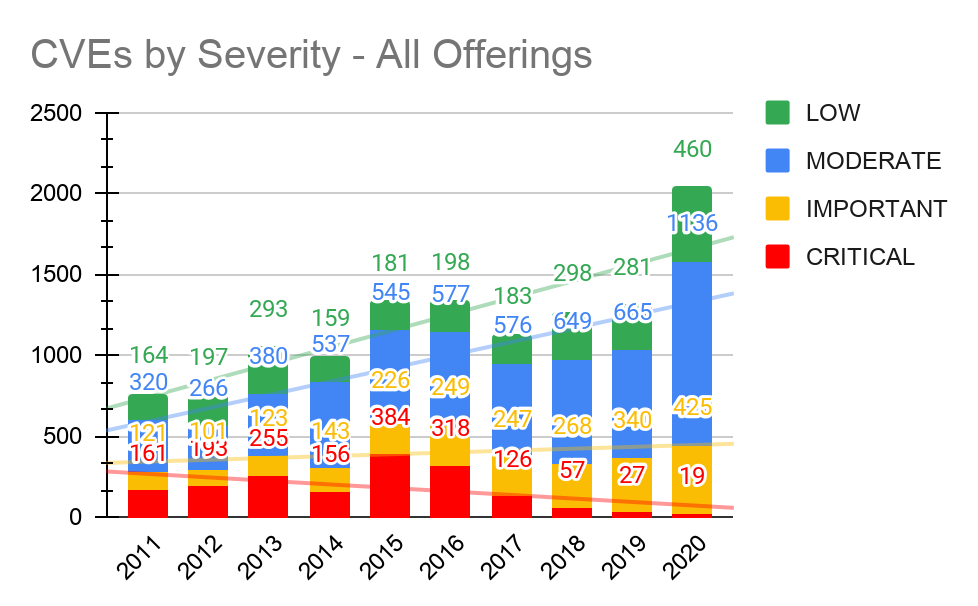 Overall the volume of issues we patched was 1.5 times higher than we had in 2019 with the average and median delivery times being down, which translates to faster availability of security updates. The volume of Moderate security flaws that were fixed in 2020 alone was more than ALL the vulnerabilities Red Hat fixed back in 2011, 2012, 2013, and 2014 (plus we fixed 460 Low severity issues as icing on that cake). This was a 3x increase in volume across the board since 2011...what do the next nine years hold? Only time will tell.