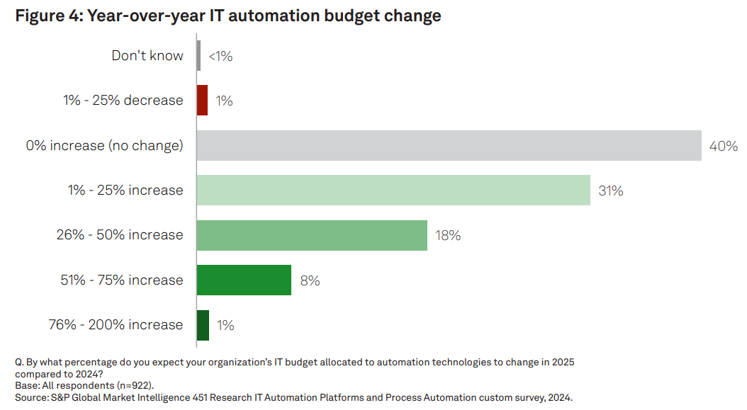 대체 텍스트: '2024년과 비교하여 2025년에 자동화 기술에 대한 조직의 IT 예산 할당이 몇 퍼센트 변동될 것으로 예상하십니까?'라는 질문에 대한 응답 결과를 보여주는 막대 차트. 응답자의 40%가 '0% 증가(변동 없음)'라고 답했습니다.