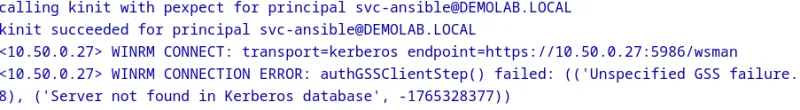 - Kerberos 데이터베이스에서 서버를 찾을 수 없음 - 이는 주로 DNS 문제 또는 잘못 구성된 Ansible 인벤토리와 관련이 있을 수 있습니다. 인벤토리의 호스트 이름이 DNS의 서버 이름과 일치하는지 확인합니다. 또한 Ansible이 WinRM 디버그 로그를 사용하여 FQDN을 통해 호스트에 연결을 시도하는지 확인합니다. 다음 예시는 Windows 서버에 대해 ansible_host 변수가 설정되어 있고 호스트 이름 대신 IP에 연결을 시도하는 경우입니다.