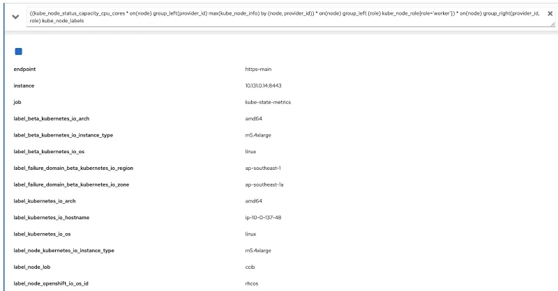 ((kube_node_status_capacity_cpu_cores * on(node) group_left(provider_id) max(kube_node_info) by (node, provider_id)) * on(node) group_left (role) kube_node_role{role='worker'}) * on(node) group_right(provider_id, role) kube_node_labels
