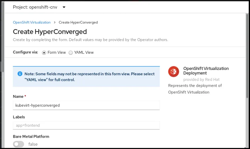 1. Create a hyperconverged cluster custom resource from the OpenShift Virtualization operator.