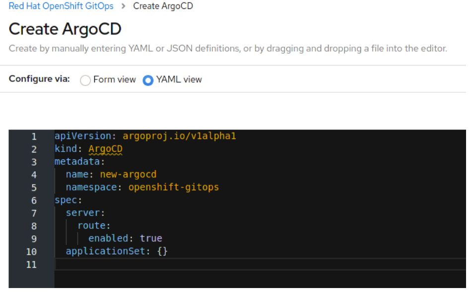 The ApplicationSet feature is bundled with the OpenShift GitOps operator, but must be enabled via the ArgoCD operand. To ensure that the ApplicationSet feature is enabled, add the applicationSet: {} YAML field to the ArgoCD operand, like below on line 10: