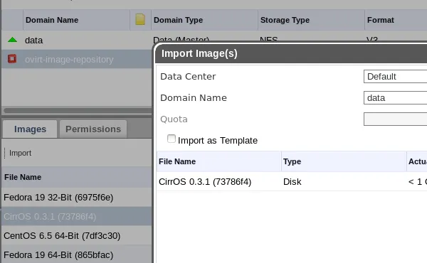 From the storage tab, you should see an "ovirt-image-repository" entry next to a little OpenStack logo. Clicking on this domain will bring up a menu of images available in this repository. Click on the "CirrOS" image (which is very small and perfect for testing) in the list and then click "Import," before hitting the OK button in the pop-up dialog to continue.