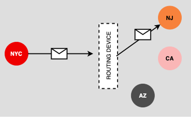 In the Anycast pattern, the router sends a message to a receiver that meets the conditions set forth in a set of determining factors. The logic of the Anycast patterns is “send this message to any receiver that meets the following conditions.” Typically the Anycast pattern is used to route a message from sender to receiver based on proximity of geolocation, as shown in Figure 9 below.
