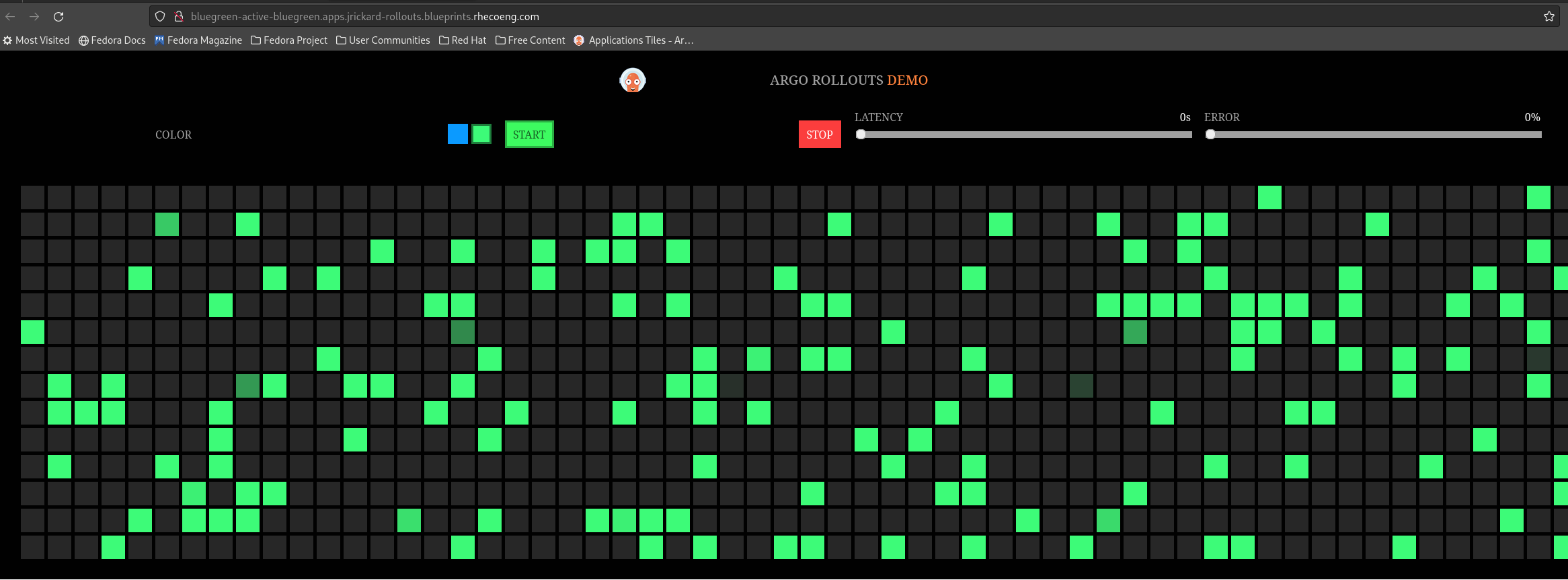 After ArgoCD recognizes the update, the rollout controller will create a ReplicaSet for the green application and start the desired number of pods. The green application uses its own service, which is exposed through a route. Once the ReplicaSet creates the pods, the rollout will pause and wait for an action to promote or abort it.
