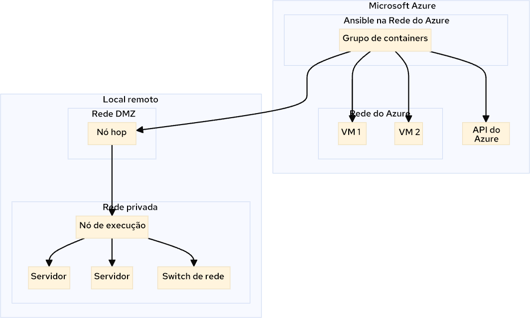 - Quando a automação precisa ser executada com recursos em outros data centers, na edge ou em circunstâncias que não permitem a conexão direta do Ansible Automation Platform on Azure, os clientes podem configurar um execution plane da automation mesh conectado ao Ansible Automation Platform on Azure.