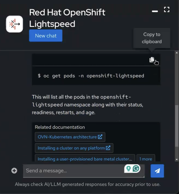 Enquanto o OpenShift Lightspeed não pode interrogar diretamente o cluster, ele pode ajudar os usuários a entender rapidamente os recursos do cluster. Se você quer saber algo sobre um cluster, tal como o número de pods operando em um namespace em particular, você pode simplesmente perguntar ao OpenShift Lightspeed. O assistente retornará um comando que os usuários podem copiar e executar para atingir seu objetivo. Ele também fornece os links de suporte para fontes de documentação oficiais que você pode seguir para se aprofundar mais.