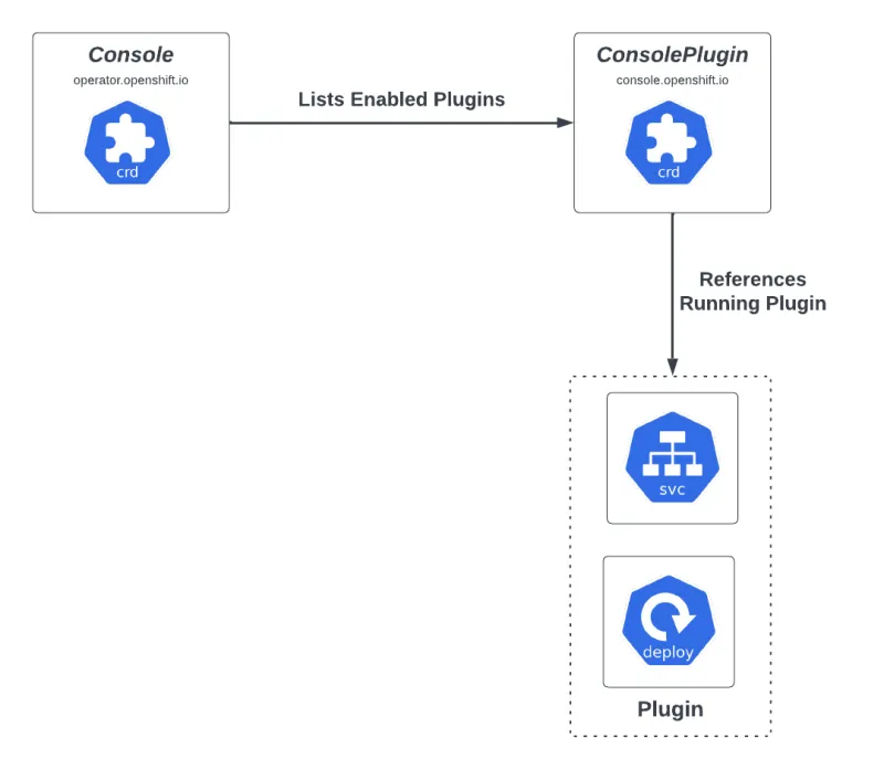 Looking at the architecture in depth, the ConsolePlugin custom resource describes the plugin itself including the name and location (the name of the service fronting the running containers and namespace) within the OpenShift cluster. The plugin becomes enabled once the reference to the ConsolePlugin is added to the list of plugins in the consoles.operator.openshift.io Custom Resource.