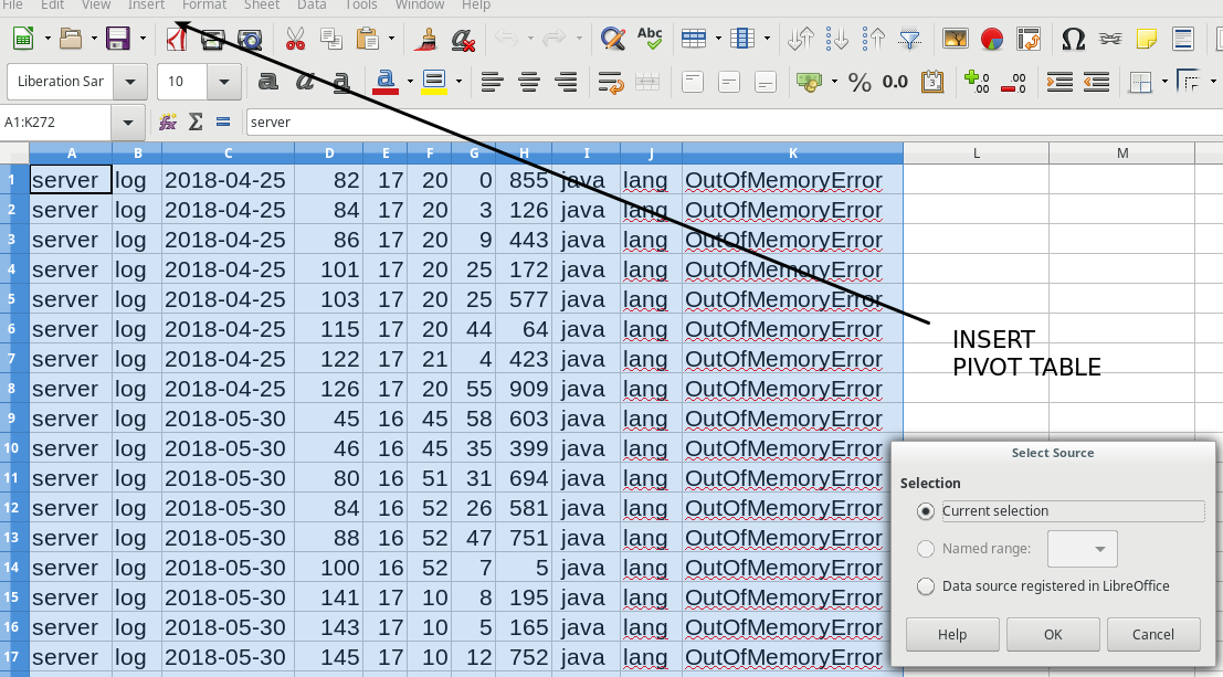On the “exceptions file“ created above, I can do more findings on the dates where these exceptions happened. Starting from here, if an OOME is actually found, one can do a deeper analysis.