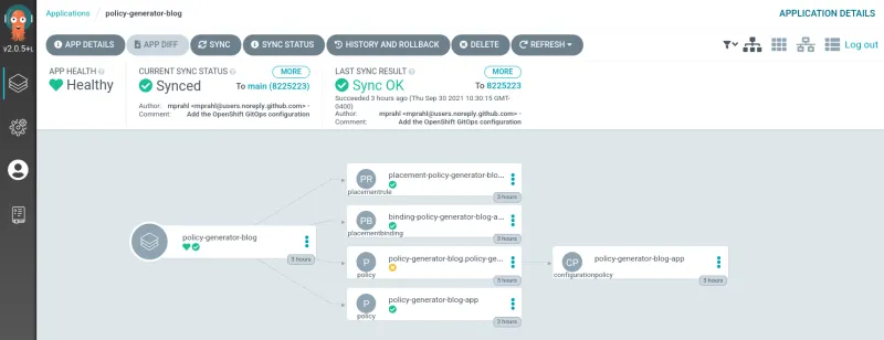 As shown in the image, the policy is successfully generated and created on the RHACM hub cluster. Notice how there is an additional policy called policy-generator-blog.policy-generator-blog-app. This shows that the policy is successfully distributed to a managed cluster. In the case of the previous screenshot, this is thelocal-clustermanaged cluster (i.e. RHACM hub cluster). Note that in order for ArgoCD to not constantly delete this distributed policy or show that the ArgoCD Application is out of sync, the following parameter value was added to thekustomization.yamlfile to set the IgnoreExtraneous option on the policy:commonAnnotations: