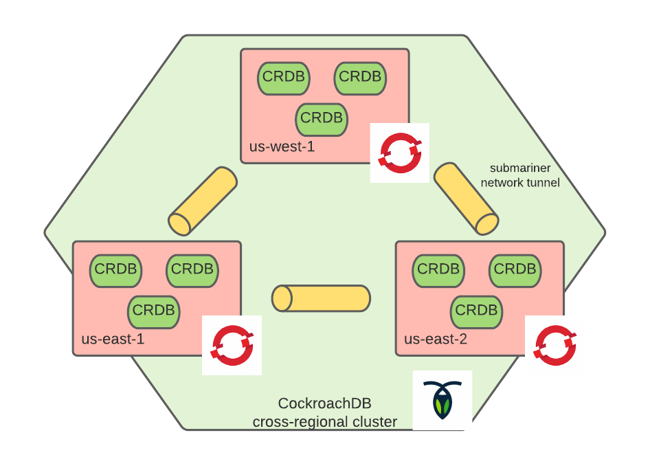 As illustrated above, each region has three instances of CockroachDB to allow for this cluster to survive not only an arbitrary node failure, but an entire site failure. Instances of the database communicate with one another in a mesh configuration by way of the Submariner network tunnel.