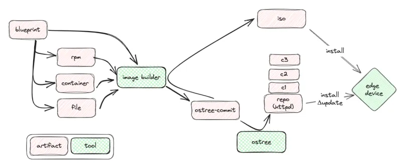 You create a blueprint toml file that declares all the rpms, container images, files and customizations you need. You hand this over to the image builder to build ostree commits. If you need an iso image to boot from, you do another osbuild run to utilize the simplified installer. For subsequent delta update, or initial network based installations, you integrate the new commit into your repo (hosted on a http server) using ostree.