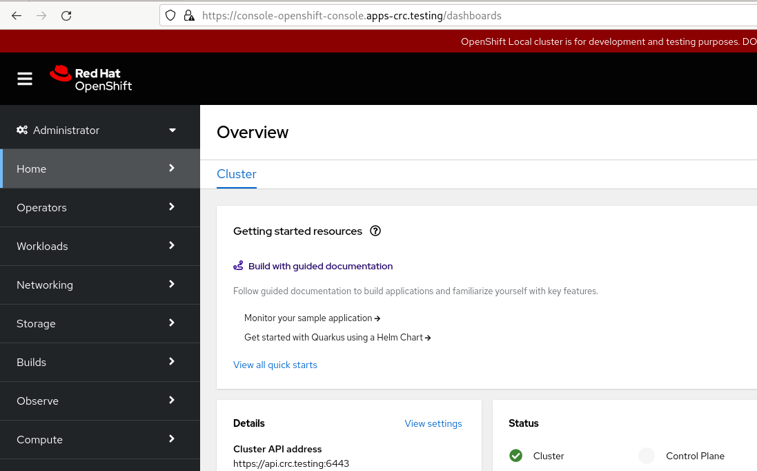 If you prefer to use the graphical console, you can access it by pointing your browser to https://console-openshift-console.apps-crc.testing: