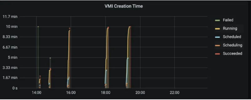 The key performance metric in our experiment is VMI creation time. We define this as the time from sending a request to create the object to when the VMI object is in the Running phase. This phase means that libvirt created the virtual machine domain and sent the command to start it. Recently, KubeVirt introduced a new metric that measures VMI phase transition latency: