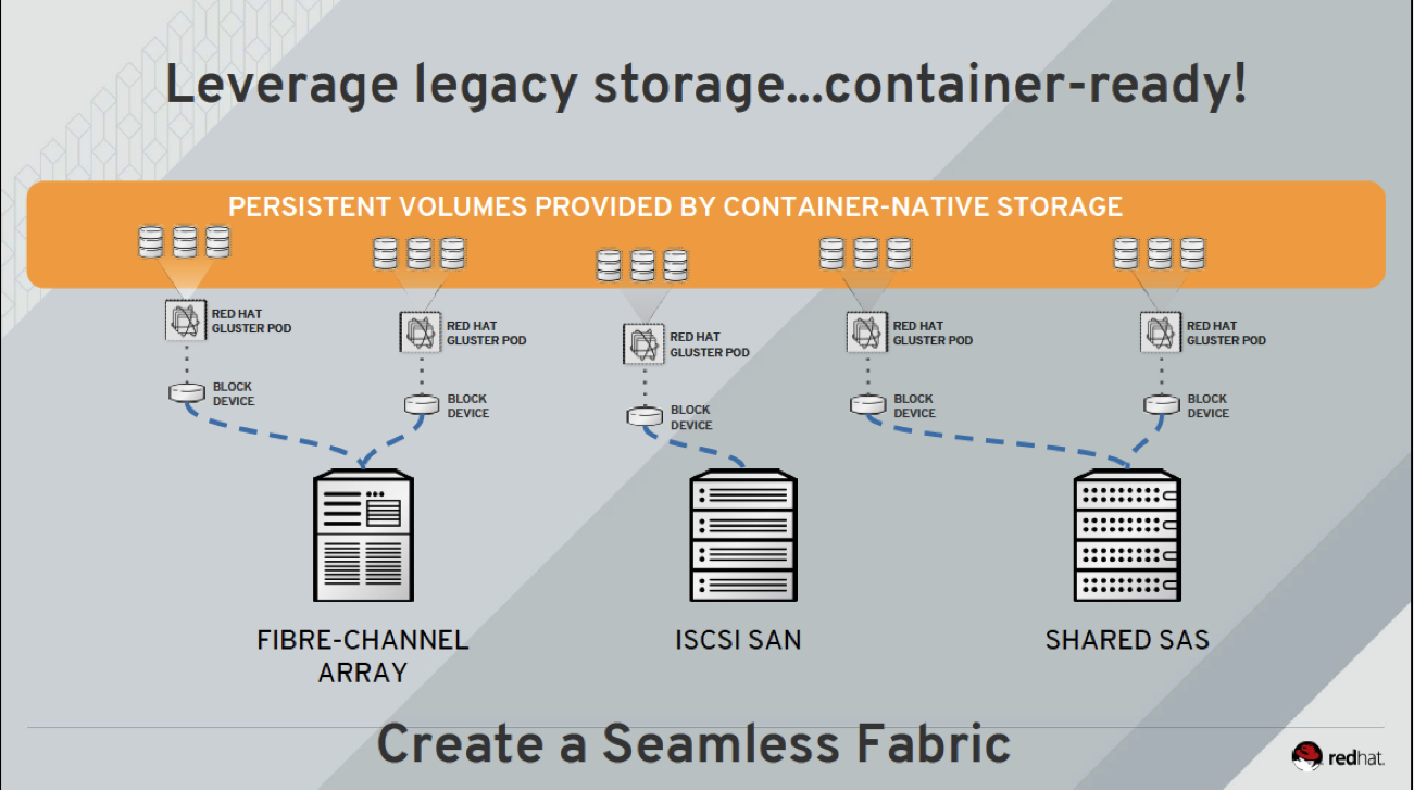 As a consequence, they are highly dependent on storage infrastructure that is already in place. Typically, it's very difficult to justify a storage server purchase when storage has been already procured a year or more ago from a traditional storage vendor for a new use case (OpenShift storage in this case). The issue is that this traditional storage was not designed for nor intended to be used with containers and the budget for storage has mostly been spent. This has driven the OpenShift operations teams to adopt CNS effectively as a storage management fabric that sits between their OpenShift Container Platform deployment and their existing storage array. The inherent flexibility of Red Hat Gluster Storage in this case is the form of CNS being leveraged, which enables it to aggregate and pool block devices that are attached to a VM and serve that out to OpenShift workloads. OpenShift operations teams can now have the best of both worlds. They can repurpose their existing storage array that is already in place/on premise but actually consume CNS which operates as a management fabric offering the latest and greatest in terms of feature, functionality, and manageability with a deep integration with the OpenShift platform.