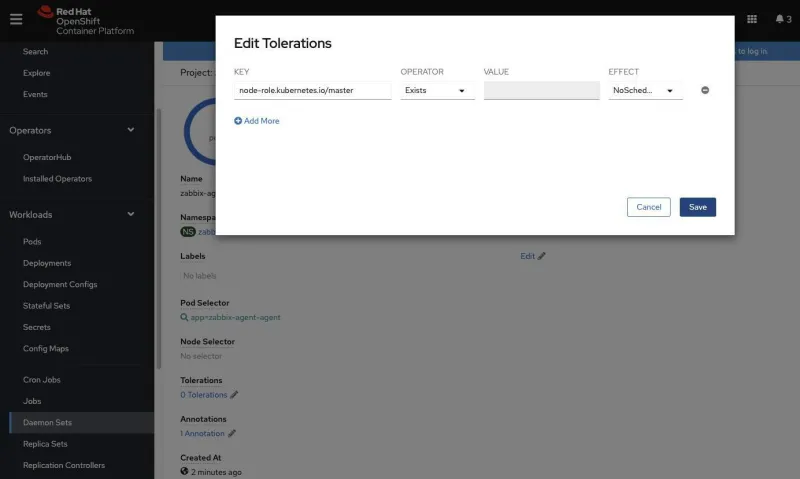 # Now, In Zabbix project, select Daemonset > click in zabbix-agent-agent > click in Tolerations and add the toleration below for create pods on Master Nodes: