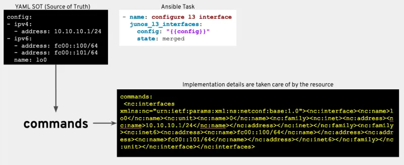 Enterprises are realizing that automating network templates in silos is still siloed engineering, and this only takes the enterprise so far. The Red Hat Ansible Automation Platform provides proscriptive and opinionated resource data models to programmatically manage the underlying data contained within the network device. That is, users are increasingly moving away from bespoke methods of configuration to more modern methods that focuses on the technology (e.g. IP addresses, VLANs, LLDP, etc) rather than the specific vendor implementation.