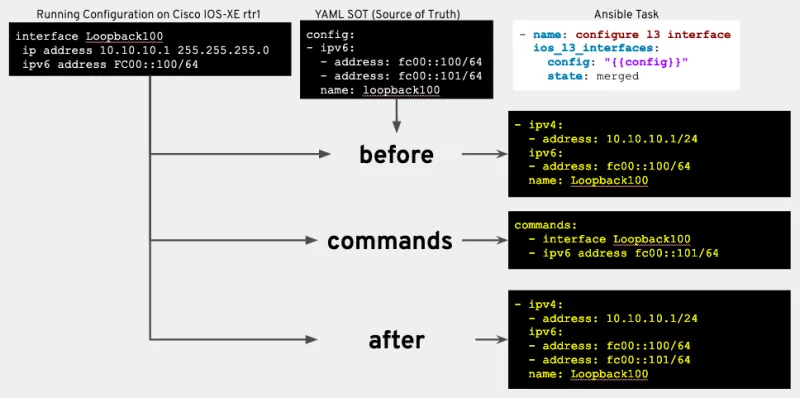 To better explain what a resource module can do, let’s take a look at the following example playbook that demonstrates an idempotent operation using the new network resource facts and eos_l3_interface module.