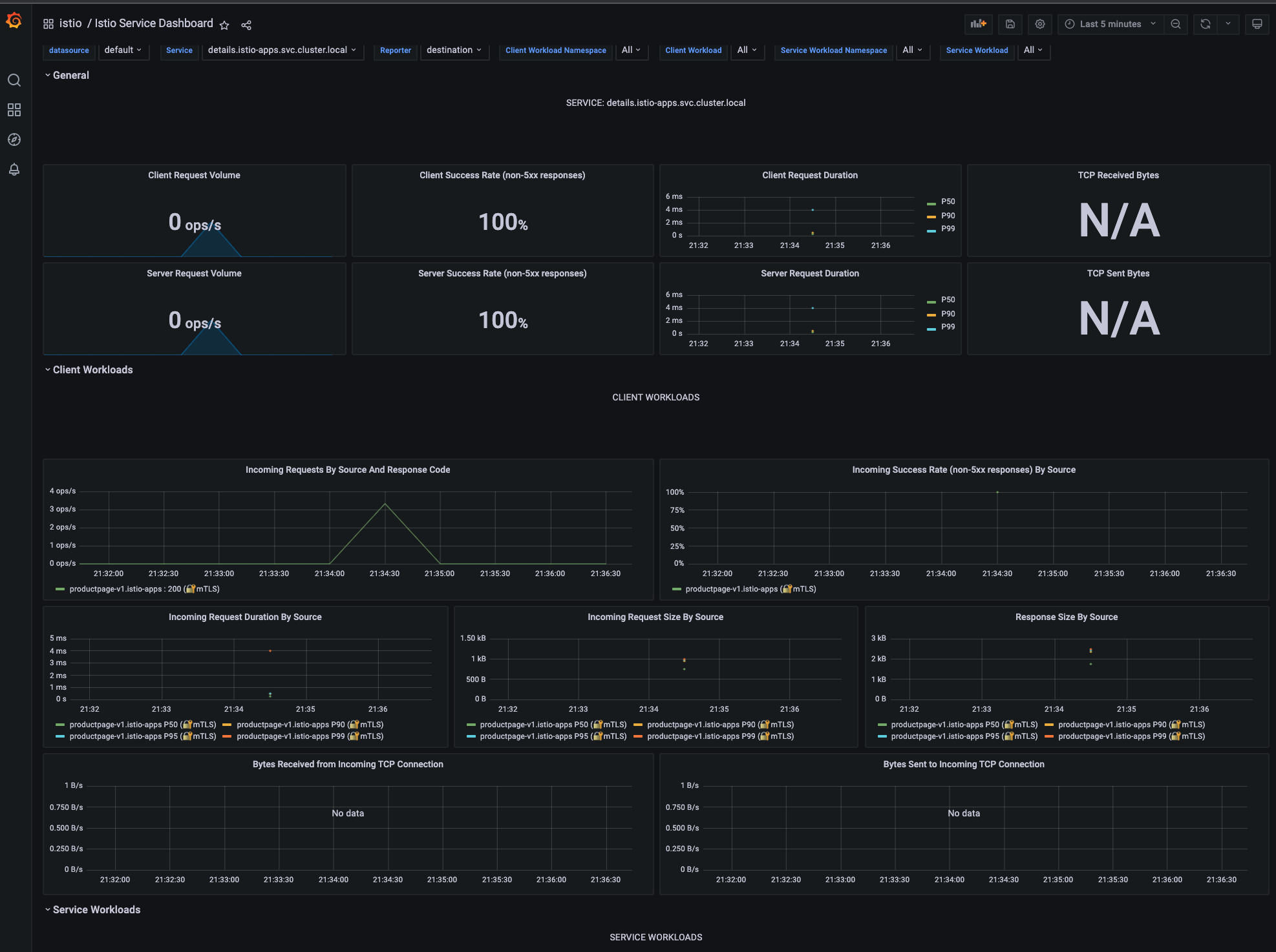 To view details about services and workloads navigate to their specific dashboards. For example, to view the metric details for the service, client workloads (workloads that are calling this service), and service workloads (workloads that are providing this service) for that service, navigate to Istio Service Dashboard. View the following screen capture:
