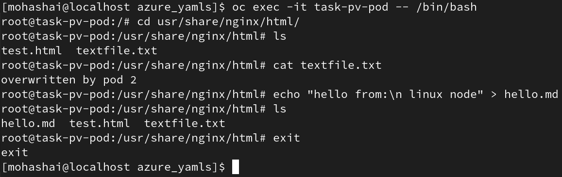 4. The directory should still be read/write accessible. List the contents of that directory and notice that the file contents are the same as the first pod. Here you can also create more files or directories.
