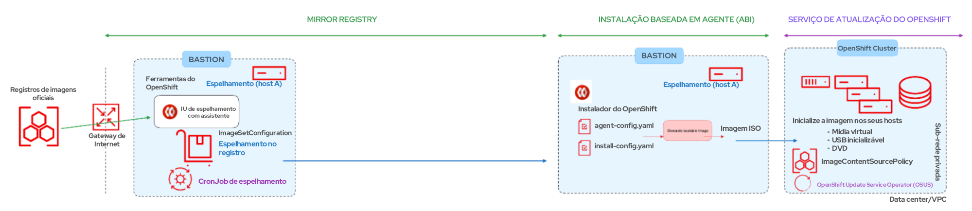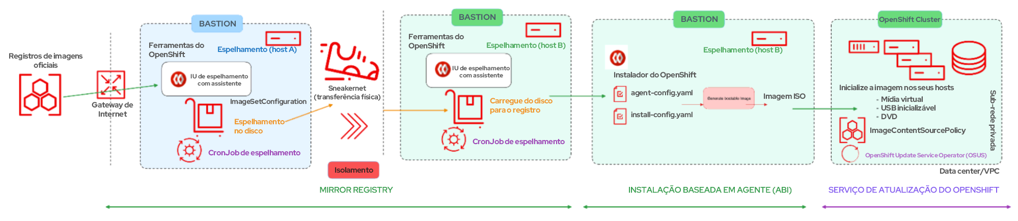 Ao operar em um ambiente desconectado, o cluster do OpenShift não tem conexão direta com a Internet, nem mesmo por meio de um proxy. Todo o conteúdo necessário de suporte ao ambiente deve ser espelhado localmente. A máquina que executa o conjunto de ferramentas oc deve ter acesso à Internet, direta ou indiretamente por um proxy, bem como acesso a um registro de imagens com a API do OpenShift.