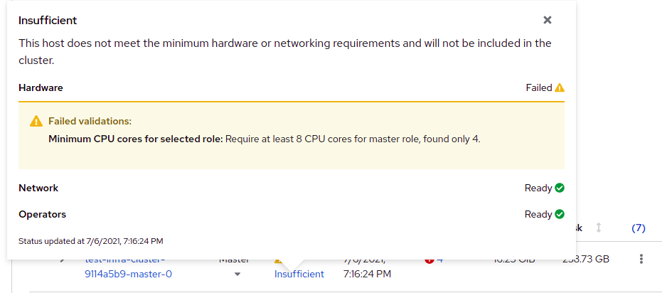 Here we have all seven nodes reporting to AI with the minimum hardware resources required for a cluster without OCS or OpenShift Virtualization. Once I enable both operators, the validations will run again and flag all hosts as insufficient to install: