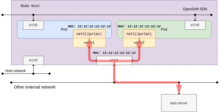 The test pods can access each other and an external web server as follows. As you can see, the ARP record for pod-b shows you the different MAC address with the associated parent interface on the node host.