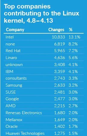 Source: Linux Kernel, Development, Report, 2017: Jonathan Corbet, LWN.net; Greg Kroah-Hartman, The Linux Foundation https://www.linuxfoundation.org/2017-linux-kernel-report-landing-page/