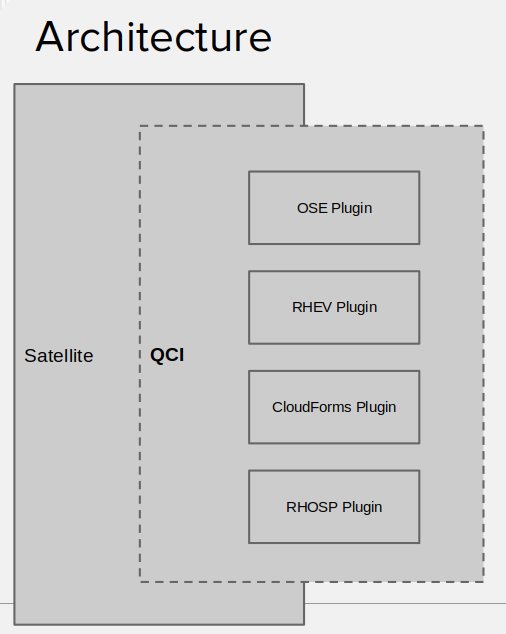 The QCI progressed and expanded by functioning as an extension (plugin) of Satellite with intentional roadmap alignment. It uses specific product plugins that interface with their individual APIs so that they can be used for both individual product installations and complete solution base installs.
