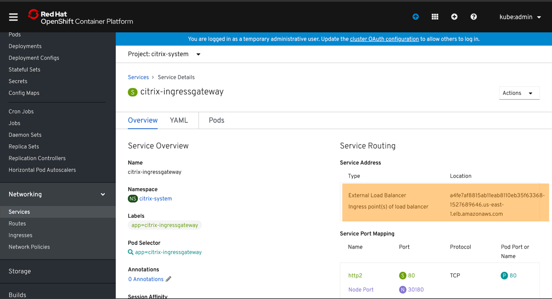 Navigate to Networking → Services and check citrix-ingressgateway service. You can use Service Address as the URL to access the Citrix ADC which is acting as the Ingress Gateway.