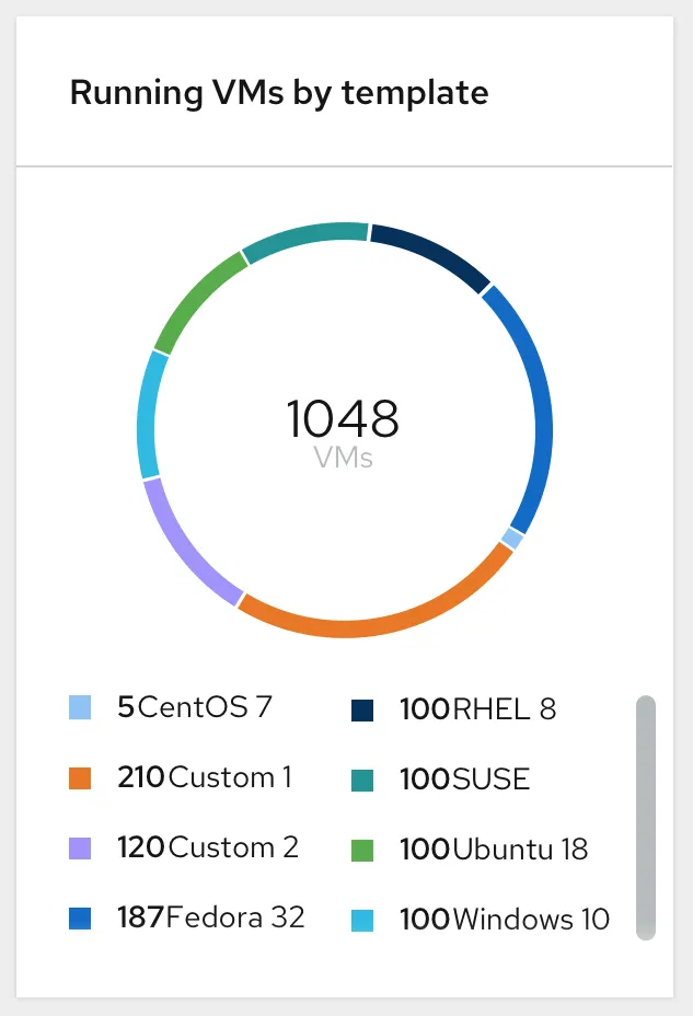 A donut chart with a unique color for each virtual machine template on the Running VMs by Template card gives users a visual breakdown of how many running virtual machines are based on a specific template. The percentage usage of each template is displayed via a tooltip on mouse-hover of each colored section of the chart.
