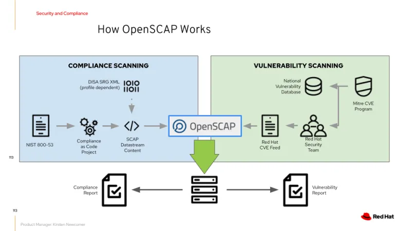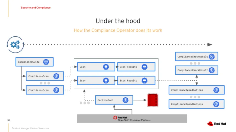 How does scanning run, and where do the security policies come from in the Compliance Operator? First of all, the Compliance Operator leverages OpenSCAP recognized in the RHEL space to scan the OpenShift cluster and the worker machines (nodes) running the cluster, using a community-based compliance content developed in the ComplianceAsCode/content project. This creates security policy content for various platforms, such as Debian, Fedora, RHEL, or Ubuntu, and security standards such as CIS Benchmark, HIPAA, PCI-DSS. The content represents the compliance benchmarks such as appropriate file owners or permissions and is distributed as a container image and independent of the operator for rapid updates of the content. For instance, SCAP components consist of Extensible Configuration Checklist Description Format (XCCDF) as the security checklists, Open Vulnerability and Assessment Language (OVAL) as assertions about the state of the system, or DataStream used for packaging other components into a single file to distribute. All the components are based on the XML format.