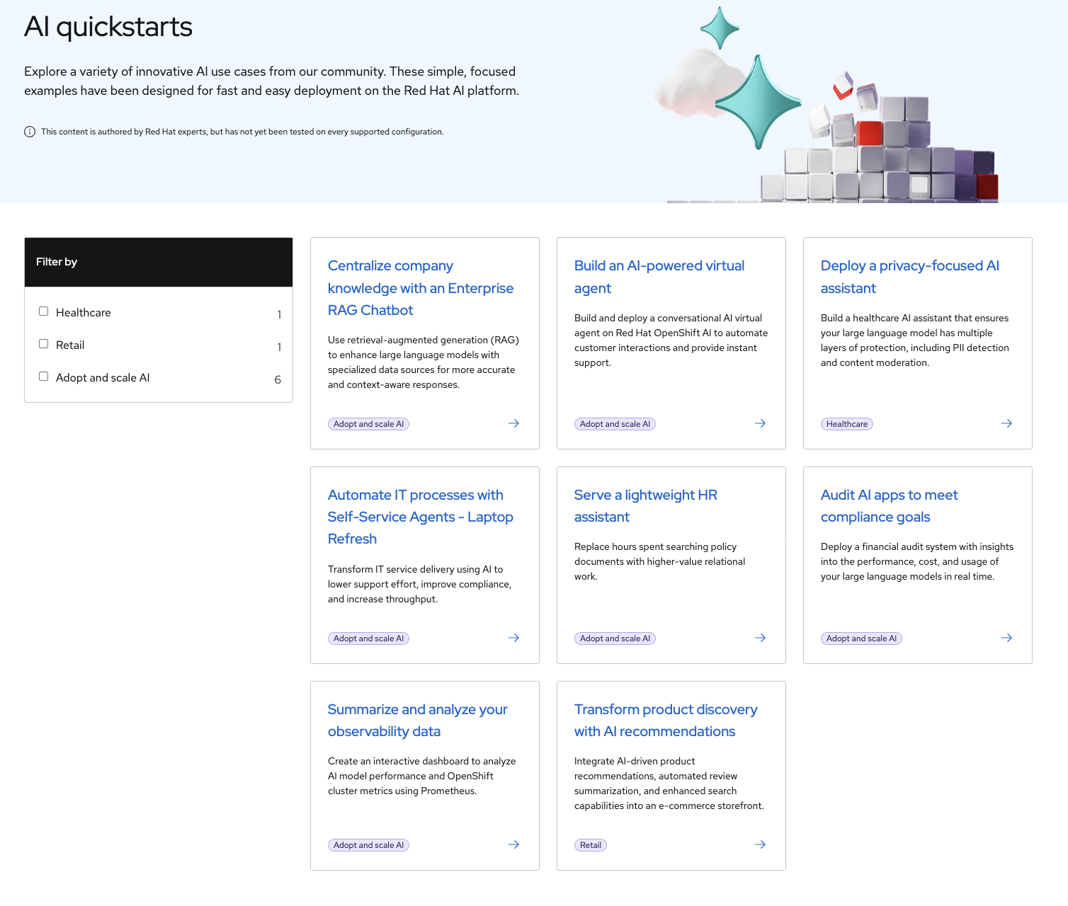For those who just want to get started, the AI quickstarts catalog page is the place for you. This includes a list of our most popular AI quickstarts so they're easier to find. Of course our catalog will continue to grow as new AI quickstarts are developed and released in the future.