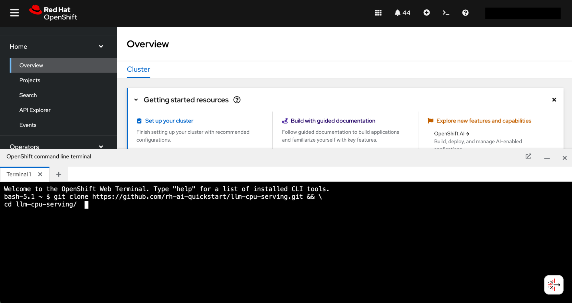 The “Serve a lightweight HR assistant” AI quickstart is particularly interesting because it can be deployed without GPUs or specialized hardware. It runs TinyLlama on CPU so anyone can use it to get started with Red Hat OpenShift AI. In fact, let’s deploy the HR assistant together: