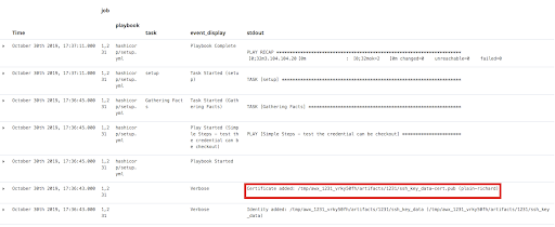 Running the template I can see the ssh-add process in action from the tower logs. In this example my logs are being sent to elasticsearch which makes things easier to find.