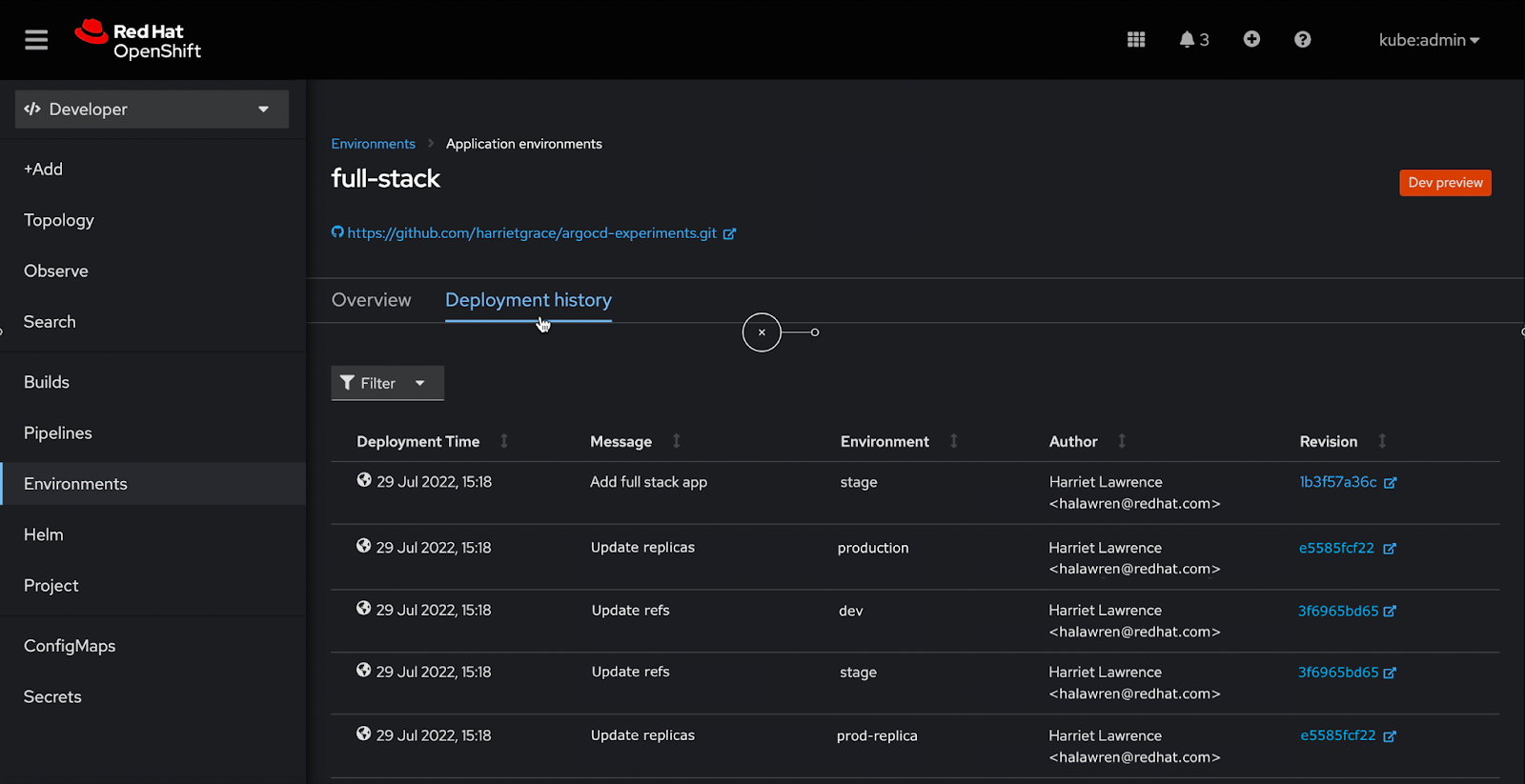 - Deployment history in the OpenShift Console (developer perspective): the GitOps Environments Details page now displays the history of successful deployments to the application environments.